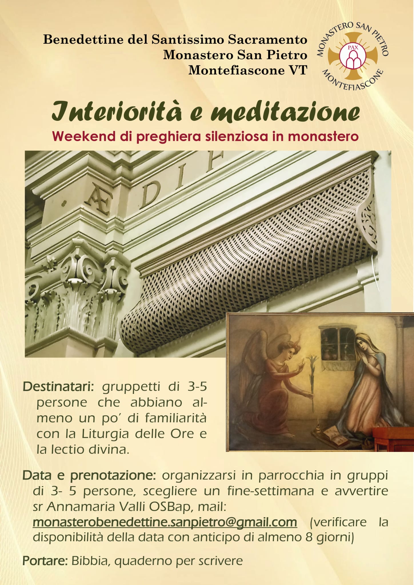 Organizza in parrocchia un gruppo di 3-5 persone, scegli un weekend e vieni a pregare e meditare con noi! Contatta sr Annamaria Valli OSBap ai recapiti di fianco per conoscere le nostre disponibilità!